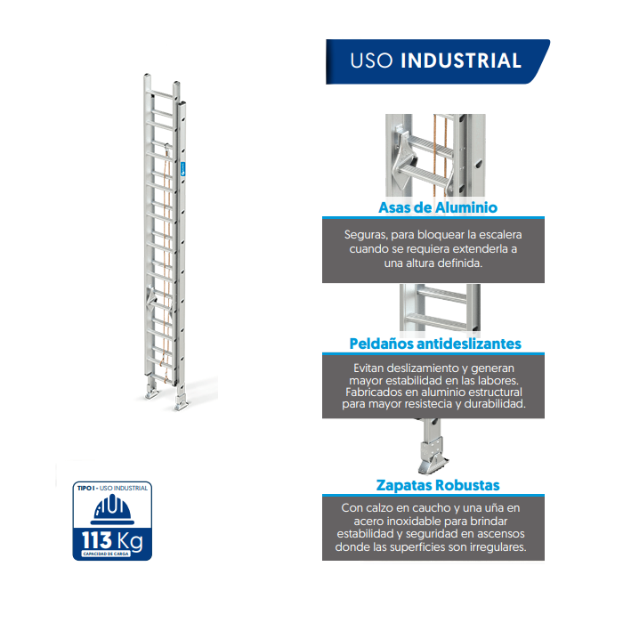 | PESO APROX.(KG) | N° DE PASOS | LARGO EXTENDIDA (M) | ALTURA UTIL APROX.(M) | ALCANCE MAX APROX (M) |